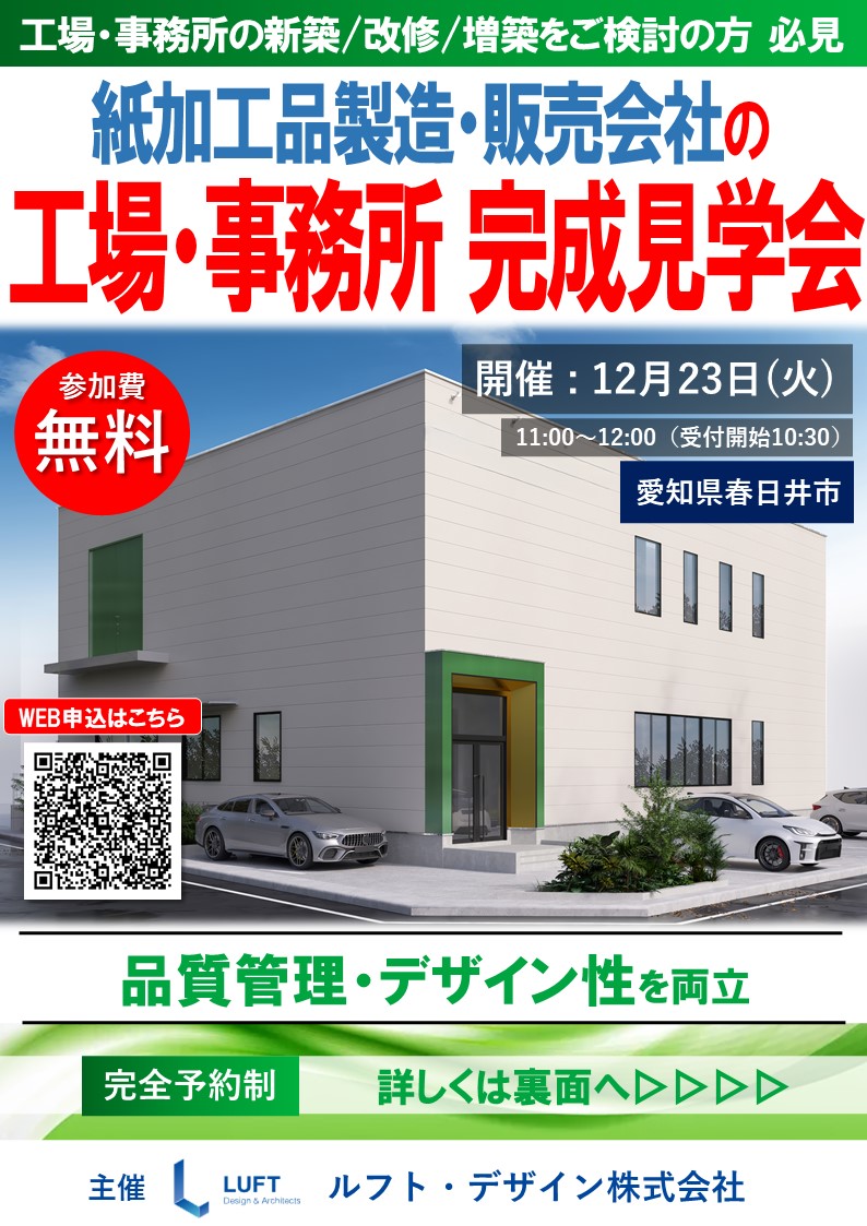 2025年12月23日(火)に紙加工品製造・販売会社の工場・事務所 完成見学会を開催いたします。
